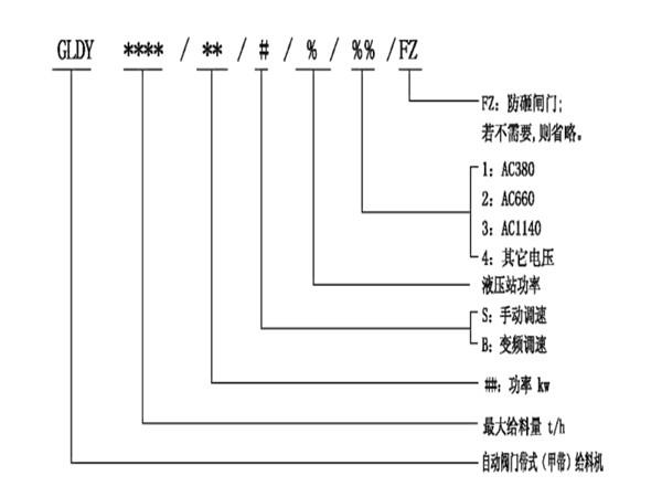 自動(dòng)閥門帶式(甲帶)給料機(jī)的型號(hào)說明: